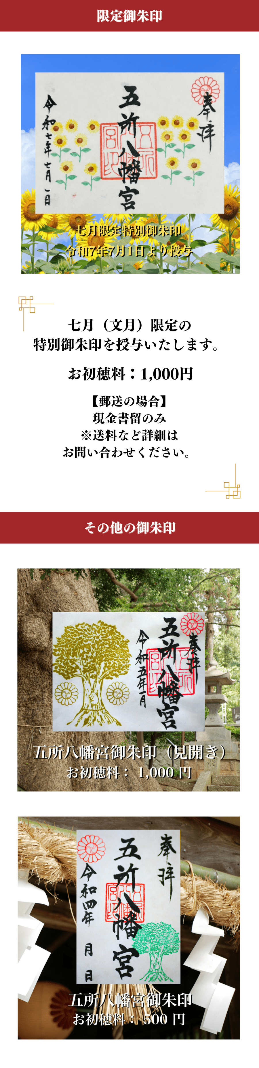 令和7年 七月(文月)限定御朱印 授与のお知らせ 2025.07.01 Tweet 令和7年文月記念御朱印 授与のお知らせ 令和7年七月(文月)記念御朱印のご紹介です。 令和7年7月1日より七月(文月)限定記念御朱印の授与を開始いたします。 当社へお詣りの折、是非ともお受けください。 ※郵送での授与も可能ですが、お時間をいただく場合がございます。ご希望の方は社務所へお電話にてお問い合わせください。 Category:お知らせ Author:admin /blog/blog_comments/captcha/31266927 /blog/blog_comments/get_token